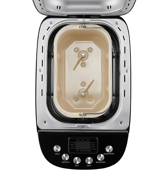 The BPA-free BACKMEISTER ® Big Black offers 15 saved programs for bread (also gluten-free), jam, cake, pasta dough or yoghurt. With the powerful, robust AC motor, among other things, 3 bread sizes and 3 degrees of browning can be made and selected – for the removable baking pan and the double kneader (both with ceramic non-stick coating). Safely standing on non-slip feet, can be pre-programmed for up to 15 hours and with lots of accessories: measuring cup and spoon, 2 kneaders, 1 hooked skewer, removable baking mold and operating instructions with recipes.
